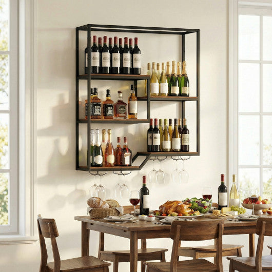 Versatile Storage Solution: This wall-mounted wine rack artfully integrates tiered shelving with glass holders providing a stylish and practical way to keep your favorite wines and glassware perfectly organized. It serves as both a functional storage unit and a decorative accent for your space.